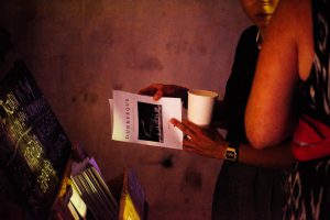 People taking booklets as they enter the camp